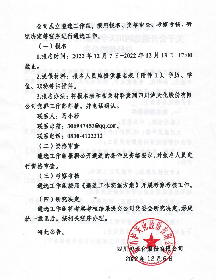 關(guān)于公開(kāi)遴選四川天宇油脂化學(xué)有限公司總經(jīng)理的公告