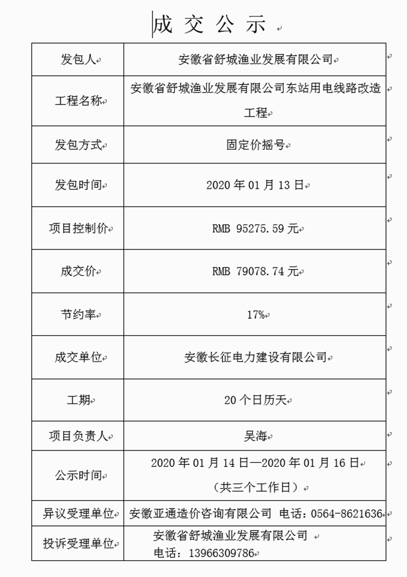 萬佛湖漁業(yè)公司東站電路改造項目成交公示